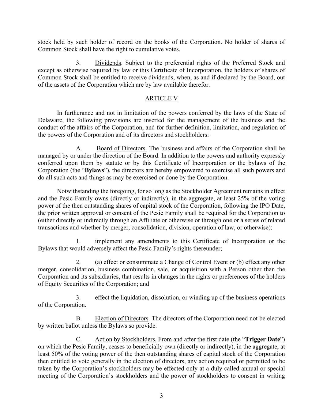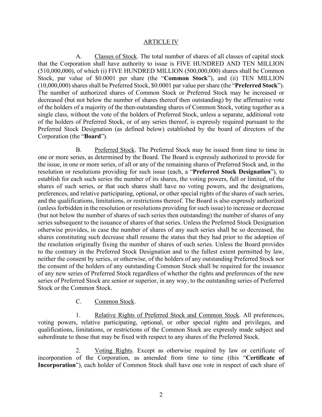 -20- officer, or trustee and shall inure to the benefit of the indemnitee’s heirs, executors, and administrators. Any amendment, alteration, or repeal of this Article 6 that adversely affects any right of an indemnitee or its successors shall be prospective only and shall not limit, eliminate, or impair any such right with respect to any proceeding involving any occurrence or alleged occurrence of any action or omission to act that took place prior to such amendment or repeal. 6.8 Severability. If any word, clause, provision or provisions of this Article 6 shall be held to be invalid, illegal or unenforceable for any reason whatsoever: (a) the validity, legality and enforceability of the remaining provisions of this Article 6 (including, without limitation, each portion of any Section or paragraph of this Article 6 containing any such provision held to be invalid, illegal or unenforceable, that is not itself held to be invalid, illegal or unenforceable) shall not in any way be affected or impaired thereby; and (b) to the fullest extent possible, the provisions of this Article 6 (including, without limitation, each such portion of any Section or paragraph of this Article 6 containing any such provision held to be invalid, illegal or unenforceable) shall be construed so as to give effect to the intent manifested by the provision held invalid, illegal or unenforceable. ARTICLE 7 Capital Stock 7.1 Certificates for Shares. The shares of the corporation shall be (a) represented by certificates or (b) uncertificated and evidenced by a book-entry system maintained by or through the corporation’s transfer agent or registrar. Certificates shall be signed by, or in the name of the corporation by, any two authorized officers of the corporation, including the Chief Executive Officer, the President, the Secretary, or the Chief Financial Officer. Within a reasonable time after the issuance or transfer of uncertificated stock, the corporation shall send or cause to be sent to the registered owner thereof a written notice or electronic transmission containing the information required by Section 151(f) of the DGCL or a statement that the corporation will furnish without charge to each stockholder who so requests the powers, designations, preferences and relative participating, optional or other special rights of each class of stock or series thereof and the qualifications, limitations or restrictions of such preferences and/or rights. 7.2 Signatures on Certificates. Any or all of the signatures on a certificate may be a facsimile. In case any officer, transfer agent or registrar who has signed or whose facsimile signature has been placed upon a certificate shall have ceased to be such officer, transfer agent or registrar before such certificate is issued, it may be issued by the corporation with the same effect as if such person were such officer, transfer agent or registrar at the date of issue. 7.3 Transfer of Stock. Upon surrender to the corporation or the transfer agent of the corporation of a certificate of shares duly endorsed or accompanied by proper evidence of succession, assignation or authority to transfer, and proper evidence of compliance with other conditions to rightful transfer, it shall be the duty of the corporation to issue a new certificate to the person entitled thereto, cancel the old certificate and record the transaction upon its books. Upon receipt of proper transfer instructions and proper evidence of compliance with other