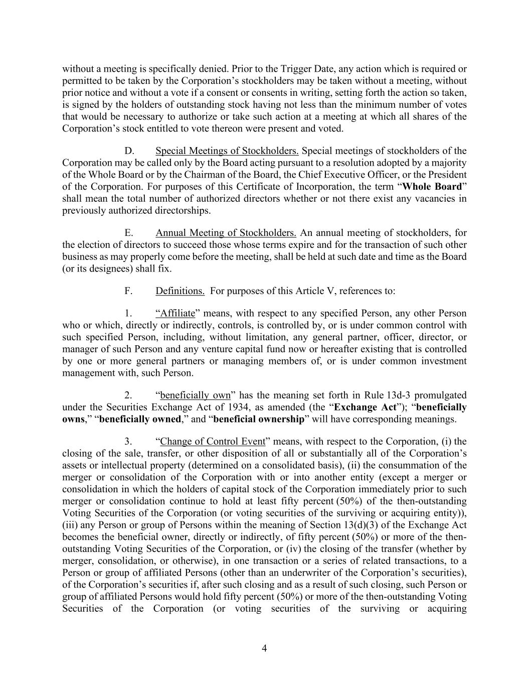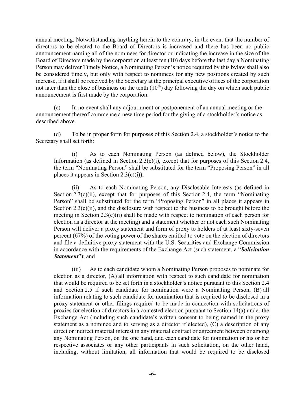 -4- Act) in such business of each Proposing Person, (2) the text of the proposal or business (including the text of any resolutions proposed for consideration and in the event that such business includes a proposal to amend the bylaws, the language of the proposed amendment), (3) a reasonably detailed description of all agreements, arrangements and understandings (x) between or among any of the Proposing Persons or (y) between or among any Proposing Person and any other record or beneficial holder(s) or person(s) who have a right to acquire beneficial ownership at any time in the future of the shares of any class or series of stock of the corporation or other person or entity (including the names of such other holder(s), person(s) or entity(ies)) in connection with the proposal of such business by such stockholder and (4) any other information relating to such item of business that would be required to be disclosed in a proxy statement or other filing required to be made in connection with solicitations of proxies in support of the business proposed to be brought before the meeting pursuant to Section 14(a) of the Exchange Act; provided, however, that the disclosures required by this Section 2.3(c) shall not include any disclosures with respect to any broker, dealer, commercial bank, trust company or other nominee who is a Proposing Person solely as a result of being the stockholder directed to prepare and submit the notice required by these bylaws on behalf of a beneficial owner. (d) For purposes of this Section 2.3, the term “Proposing Person” shall mean (i) the stockholder providing the notice of business proposed to be brought before an annual meeting, (ii) the beneficial owner or beneficial owners, if different, on whose behalf the notice of the business proposed to be brought before the annual meeting is made, (iii) any participant (as defined in paragraphs (a)(ii)-(vi) of Instruction 3 to Item 4 of Schedule 14A) with such stockholder in such solicitation and (iv) any affiliates of such persons in (i) through (iii). (e) A Proposing Person shall update and supplement its notice to the corporation of its intent to propose business at an annual meeting, if necessary, so that the information provided or required to be provided in such notice pursuant to this Section 2.3 shall be true and correct as of the record date for stockholders entitled to vote at the meeting and as of the date that is ten (10) business days prior to the later of the meeting or any adjournment or postponement thereof, and such update and supplement shall be delivered to, or mailed and received by, the Secretary at the principal executive offices of the corporation (i) not later than five (5) business days after the record date for stockholders entitled to vote at the meeting (in the case of the update and supplement required to be made as of such record date), and (ii) not later than eight (8) business days prior to the later of the date for the meeting or, if practicable, any adjournment or postponement thereof (and, if not practicable, on the first practicable date prior to the date to which the meeting has been adjourned or postponed) (in the case of the update and supplement required to be made as of ten (10) business days prior to the later of the meeting or any adjournment or postponement thereof). For the avoidance of doubt, the obligation to update and supplement as set forth in this paragraph or any other Section of these bylaws shall not limit the corporation’s rights with respect to any deficiencies in any notice provided by a stockholder, extend any applicable deadlines hereunder or enable or be deemed to permit a stockholder who has previously submitted notice hereunder to amend or update any proposal or to submit any new proposal, including by changing or adding matters, business or resolutions proposed to be brought before a meeting of the stockholders.