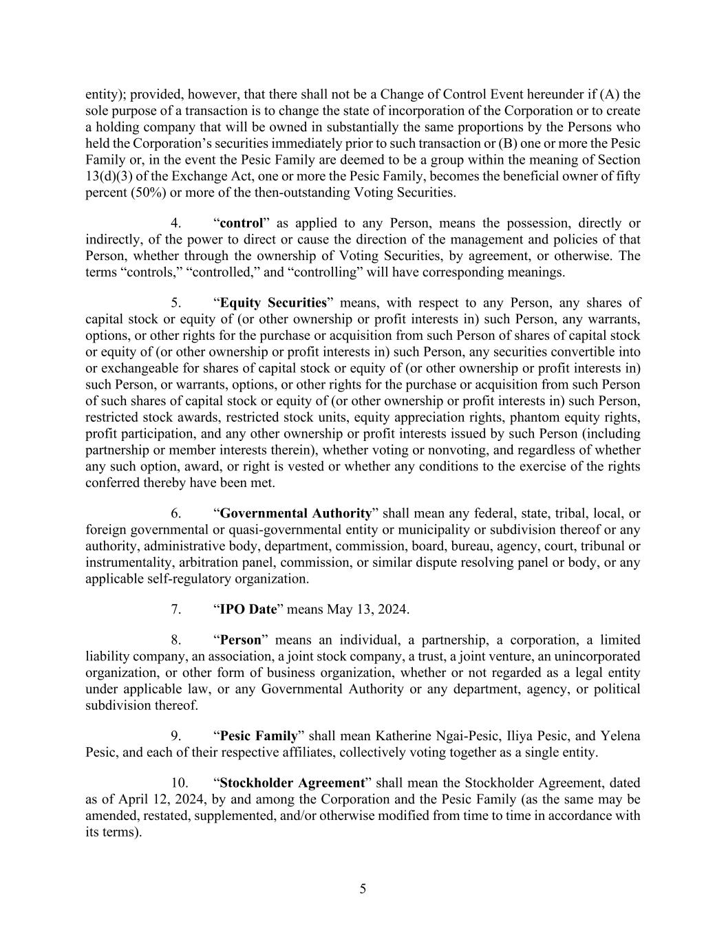 -2- meeting, business must be (i) specified in the notice of meeting (or any supplement thereto) given by or at the direction of the Board of Directors, (ii) otherwise properly brought before the meeting by or at the direction of the Board of Directors, or (iii) otherwise properly brought before the meeting by a stockholder of record. A motion related to business proposed to be brought before any stockholders’ meeting may be made by any stockholder entitled to vote if the business proposed is otherwise proper to be brought before the meeting. (b) Without qualification, for business to be properly brought before an annual meeting by a stockholder, the stockholder must (i) provide Timely Notice (as defined below) thereof in writing and in proper form to the Secretary of the corporation (even if such matter is already the subject of any notice to the stockholders or Public Disclosure from the Board of Directors) and (ii) provide any updates or supplements to such notice at the time and in the forms required by this Section 2.3. To be timely, the stockholder’s notice must be delivered to, or mailed and received at, the principal executive offices of the corporation not more than one hundred twenty (120) days nor less than ninety (90) days in advance of the anniversary of the date of the corporation’s proxy statement provided in connection with the previous year’s annual meeting of stockholders (which anniversary date, for purposes of the corporation’s first annual meeting of stockholders following the consummation of the initial public offering of the common stock of the corporation (the “IPO”) shall be deemed to be May 15, 2024); provided, however, that in the event that no annual meeting was held in the previous year or the annual meeting is called for a date that is more than thirty (30) days before or after the anniversary date of the previous year’s annual meeting, notice by the stockholder must be received by the Secretary of the corporation not later than the close of business on the later of (x) the ninetieth (90th) day prior to such annual meeting and (y) the tenth (10th) day following the day on which public announcement of the date of such meeting is first made (such notice within such time periods, “Timely Notice”). For the purposes of these bylaws, “public announcement” shall mean disclosure in a press release reported by the Dow Jones News Service, Associated Press or a comparable national news service or in a document publicly filed by the corporation with the Securities and Exchange Commission. In no event shall the public announcement of an adjournment or postponement of an annual meeting commence a new time period (or extend any time period) for the giving of a stockholder’s notice as described above. (c) To be in proper form for purposes of this Section 2.3, a stockholder’s notice to the Secretary of the corporation shall set forth: (i) As to each Proposing Person (as defined below), (1) the name and address of such Proposing Person (including, if applicable, the name and address that appears on the corporation’s books and records); and (2) the number of shares of each class or series of stock of the corporation that are, directly or indirectly, owned of record or beneficially owned (within the meaning of Rule 13d-3 under the Securities Exchange Act of 1934 (the “Exchange Act”)) by such Proposing Person, except that such Proposing Person shall in all events be deemed to beneficially own any shares of any class or series of stock of the corporation as to which such Proposing Person has a right to acquire beneficial ownership at any time in the future (the disclosures to be made pursuant to the foregoing clauses (1) and (2) are referred to as “Stockholder Information”); (ii) As to each Proposing Person, (1) the full notional amount of any securities that, directly or indirectly, underlie any “derivative security” (as such term is defined in