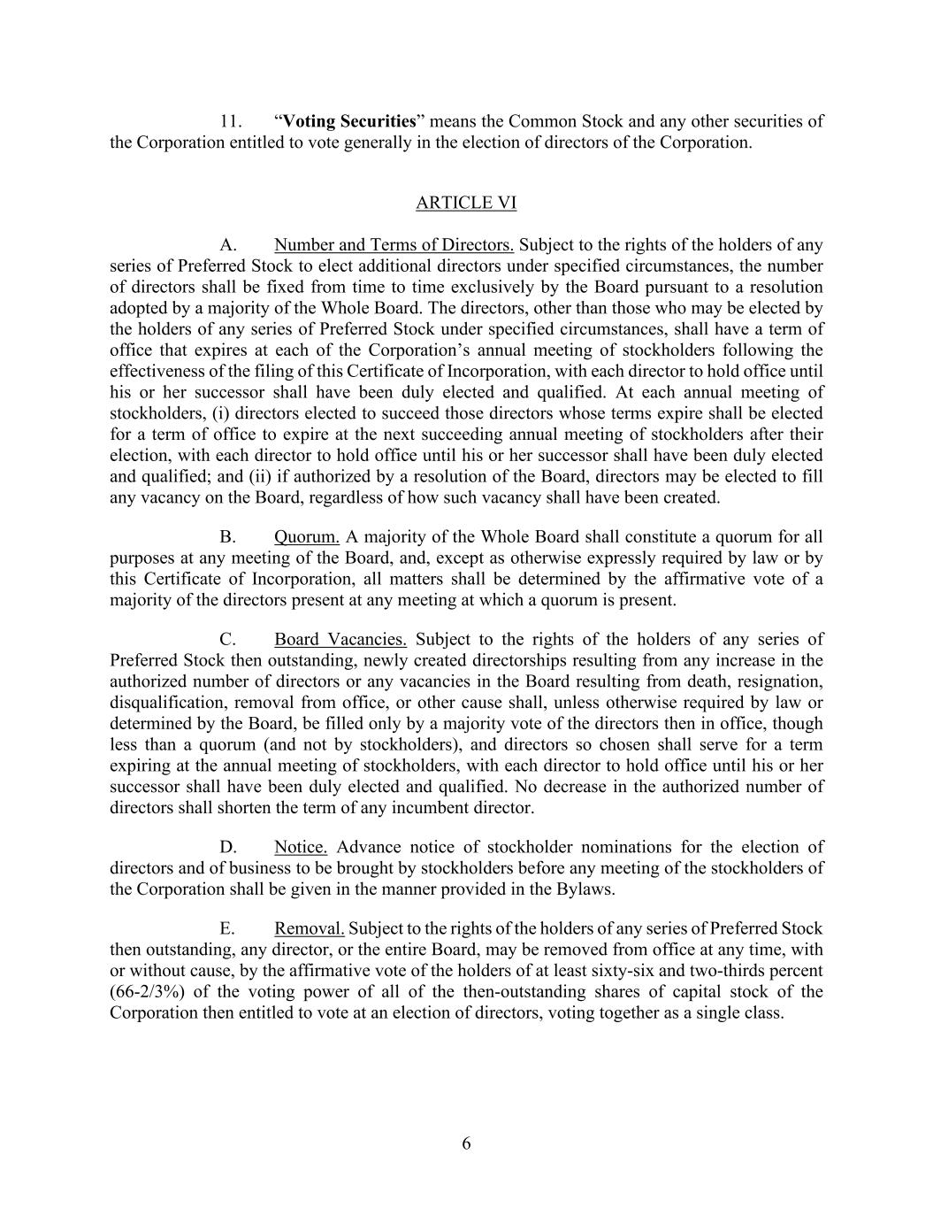 -13- Board of Directors’ or the Nominating and Corporate Governance Committee’s consideration. If such director’s resignation is accepted by the Board of Directors or the Nominating and Corporate Governance Committee, then the Board of Directors or the Nominating and Corporate Governance Committee, in its sole discretion, may fill the resulting vacancy or may decrease the size of the Board of Directors. 3.3 Enlargement and Vacancies. Except as otherwise provided by the certificate of incorporation of the corporation, subject to the rights of the holders of any series of preferred stock then outstanding, newly created directorships resulting from any increase in the authorized number of directors or any vacancies in the Board of Directors resulting from death, resignation, disqualification, removal from office or other cause shall, unless otherwise required by law or determined by the Board of Directors, be filled solely by a majority vote of the directors then in office, although less than a quorum, or by the sole remaining director. If there are no directors in office, then an election of directors may be held in the manner provided by statute. Directors chosen pursuant to any of the foregoing provisions shall hold office until the next annual election and until such director’s successor is duly elected and qualified or until such director’s earlier resignation, removal, death or incapacity. In the event of a vacancy in the Board of Directors, the remaining directors, except as otherwise provided by law, or by the certificate of incorporation of the corporation or these bylaws, may exercise the powers of the full Board of Directors until the vacancy is filled. 3.4 Resignation and Removal. Any director may resign at any time upon written or electronic notice to the corporation addressed to the attention of the Chief Executive Officer, the Secretary, the Chairman of the Board of Directors or the Chair of the Nominating and Corporate Governance Committee of the Board of Directors, who shall in turn notify the full Board of Directors (although failure to provide such notification to the full Board of Directors shall not impact the effectiveness of such resignation). Such resignation shall be effective upon receipt of such notice by one of the individuals designated above unless the notice specifies such resignation to be effective at some other time or upon the happening of some other event. Subject to the rights of the holders of any series of preferred stock then outstanding, any director, or the entire Board of Directors, may be removed from office at any time, with or without cause, by the affirmative vote of the holders of at least a majority of the voting power of all of the then-outstanding shares of capital stock of the corporation then entitled to vote at an election of directors, voting together as a single class. 3.5 Powers. The business of the corporation shall be managed by or under the direction of the Board of Directors, which may exercise all such powers of the corporation and do all such lawful acts and things as are not by statute or by the certificate of incorporation of the corporation or by these bylaws directed or required to be exercised or done by the stockholders. 3.6 Chairman of the Board of Directors. The directors shall elect a Chairman of the Board of Directors and may elect a Vice Chair of the Board of Directors, each to hold such office until their successor is elected and qualified or until their earlier resignation or removal. In the absence or disability of the Chairman of the Board of Directors, the Vice Chair of the Board of Directors, if one has been elected, or another director designated by the Board of Directors, shall perform the duties and exercise the powers of the Chairman of the Board of Directors. The Chairman of the Board of Directors of the corporation may preside at all meetings of the