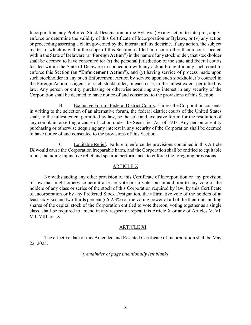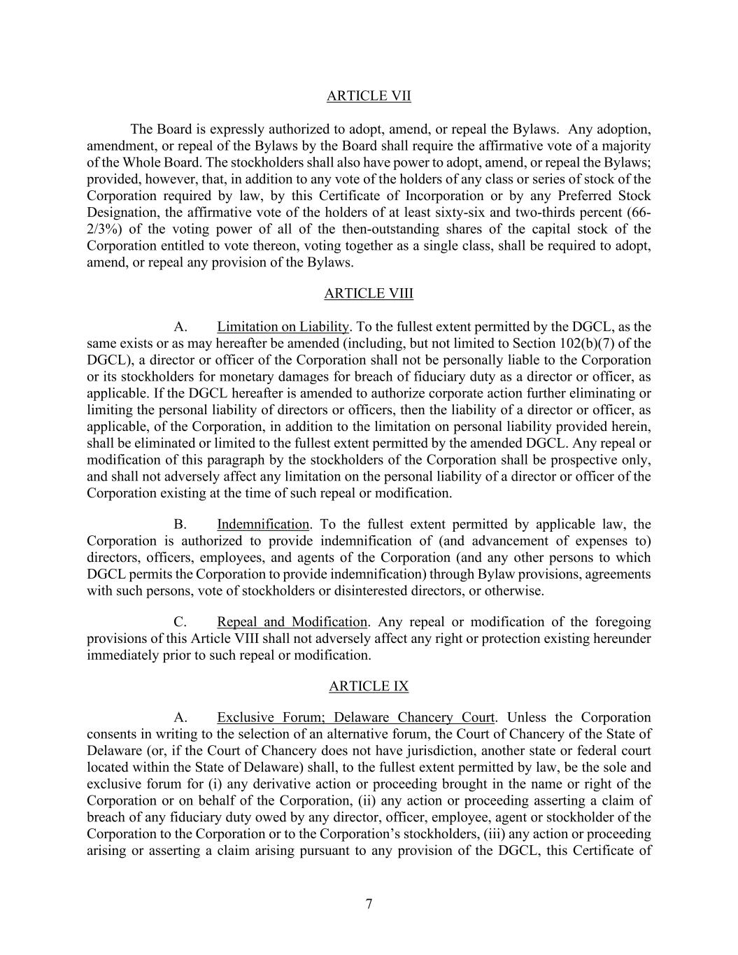 -23- 9.3 Failure to Enforce Exclusive Forum. Failure to enforce the provisions contained in this Article 9 would cause the corporation irreparable harm, and the corporation shall be entitled to equitable relief, including injunctive relief and specific performance, to enforce the foregoing provisions. ARTICLE 10 Amendments Subject to the laws of the State of Delaware, the Board of Directors is expressly authorized to adopt, amend or repeal the bylaws of the corporation, without any action on the part of the stockholders, by the affirmative vote of at least a majority of the Board of Directors. In addition to any vote of the holders of any class or series of stock of the corporation required by law, by the certificate of incorporation of the corporation, or by any Preferred Stock Designation, the bylaws may also be adopted, amended or repealed by the affirmative vote of the holders of at least sixty- six and two-thirds percent (66-2/3%) of the voting power of all of the then-outstanding shares of the capital stock of the corporation entitled to vote thereon, voting together as a single class.